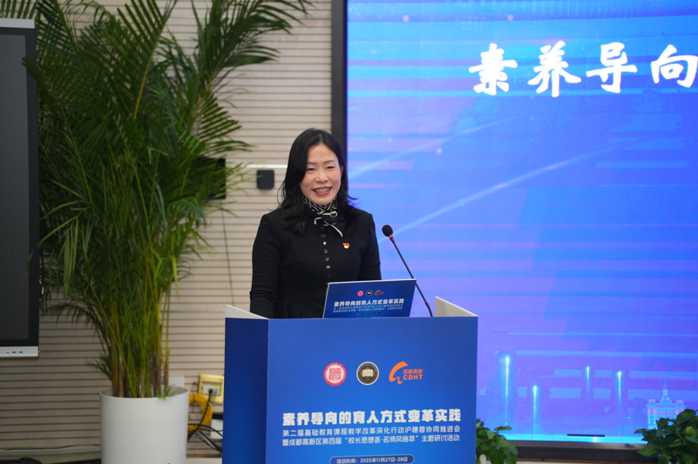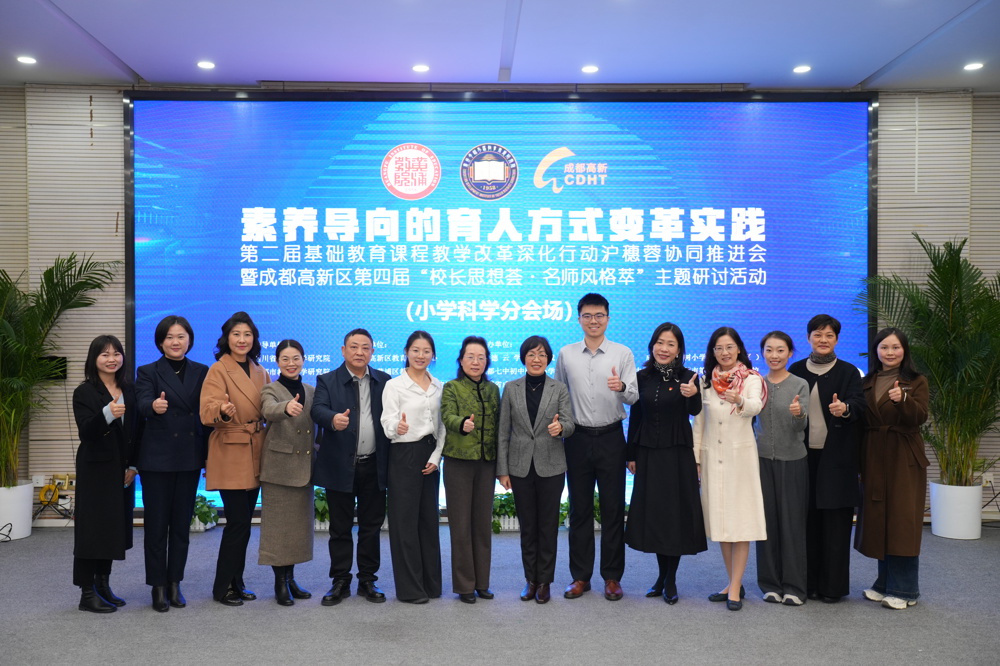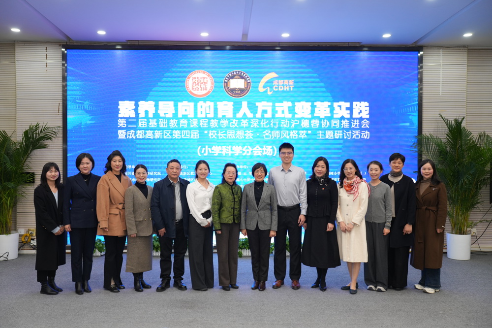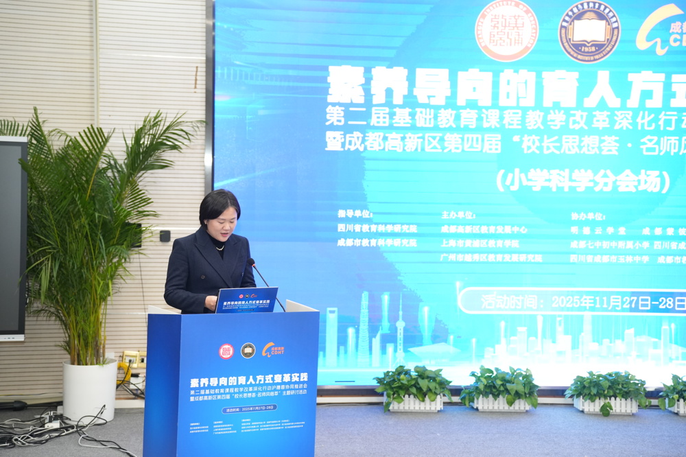 深秋蓉城,教育群贤毕至。为深入贯彻《教育强国建设规划纲要(2024—2035年)》的战略部署,扎实落地教育部关于义务教育教学改革实验区的建设要求,2025年11月27日,由四川省教育科学研究院、成都市教育科学研究院提供专业指导,成都高新区教育发展中心、上海市黄浦区教育学院、广州市越秀区教育发展研究院三地强强联合、共同主办的“第二届基础教育课程教学改革深化行动沪穗蓉协同推进会暨成都高新区第四届‘校长思想荟·名师风格萃’主题研讨活动”在我校举行。