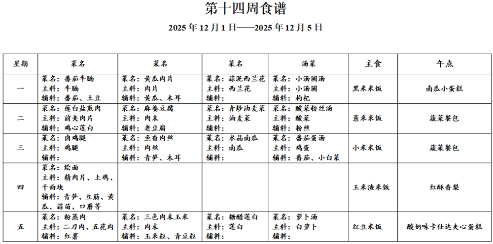请各位家长查看第十四周午餐菜谱,若您的孩子对某样食材过敏,请一定要提前告知班主任老师哟,谢谢!