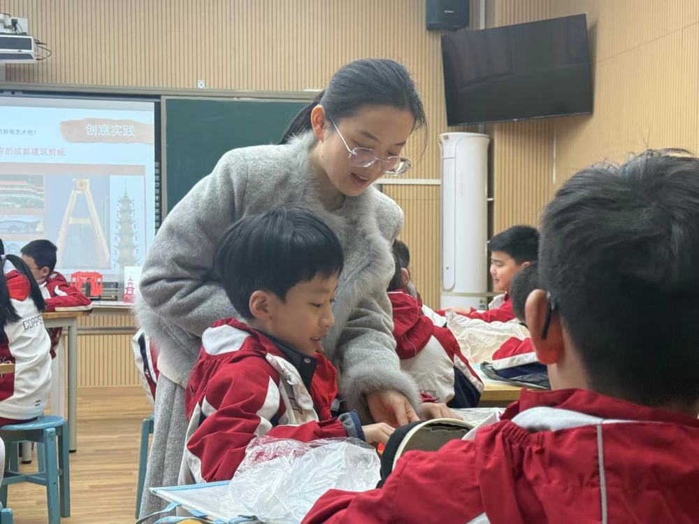 孙莉雯老师以一段融合传统剪纸与现代艺术的短片切入,迅速吸引了学生的注意力。她从剪纸的历史讲起,联系窗花、文创产品等生活实例,引导学生感受这项古老技艺在当代的活力,理解艺术与生活的紧密联系。教学中,孙老师将知识讲解与动手实践巧妙结合。她清晰演示了对称的基本美感,更鼓励学生将剪纸艺术与成都特色建筑结合。孩子们专注地折、画、剪,平凡的纸张逐渐变成灵动的图案,创意在指尖自由流淌。