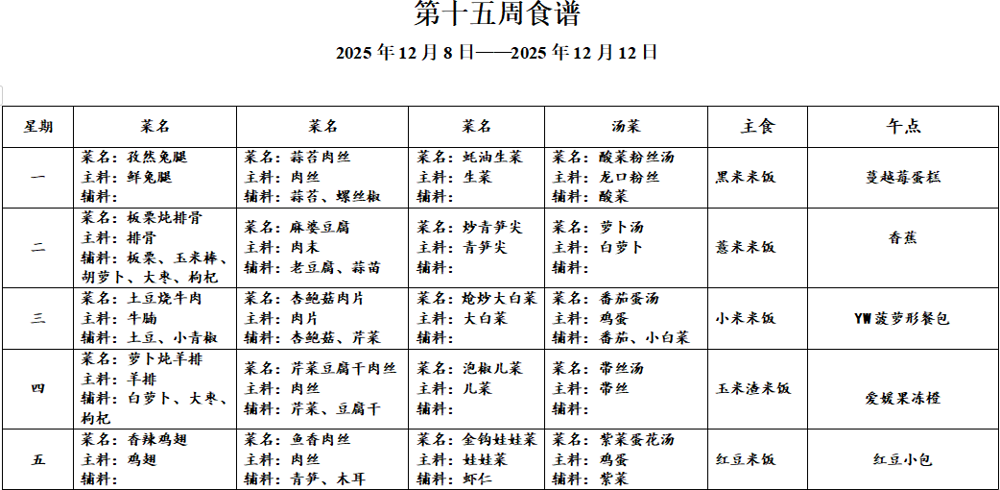 请各位家长查看第十五周午餐菜谱,若您的孩子对某样食材过敏,请一定要提前告知班主任老师哟,谢谢!