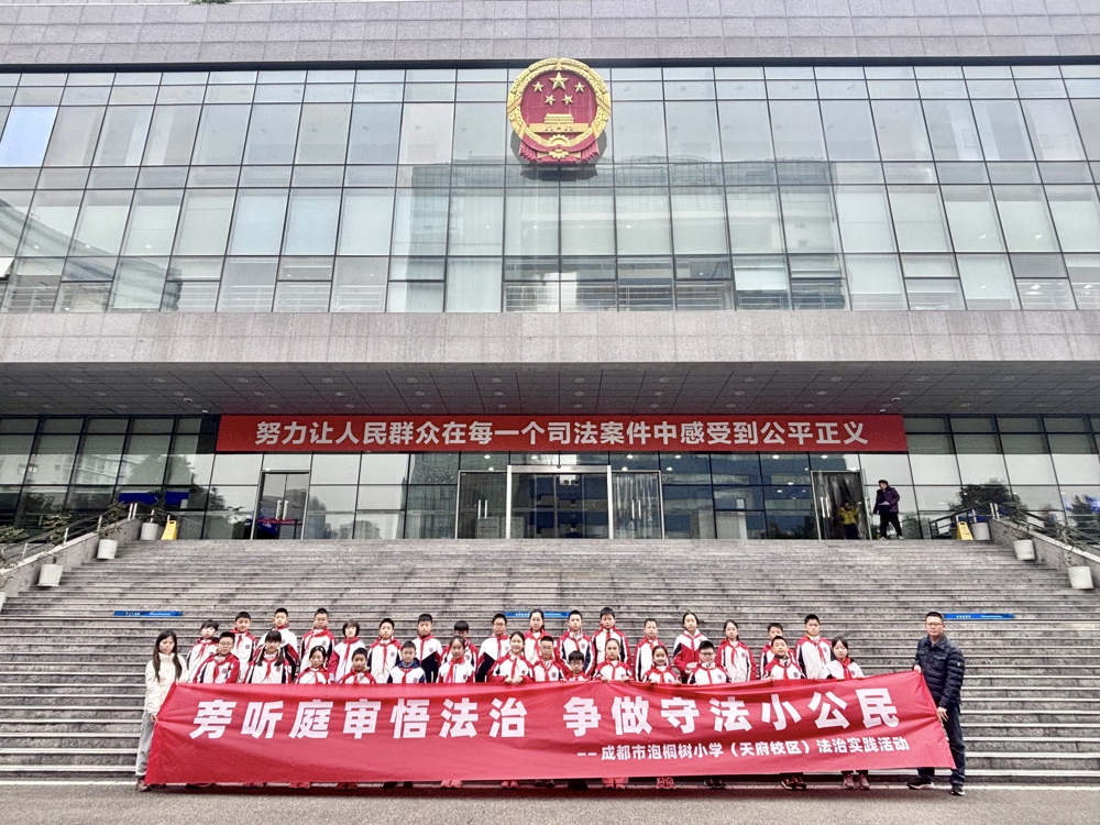正值 12 月法治文化月,为让法治精神真正走进校园、浸润心灵,成都市泡桐树小学(天府校区)于12月8日组织部分五年级学生,在道德与法治学科教师及学校安全办公室老师的共同带领下,前往成都高新技术产业开发区人民法院开展庭审旁听实践活动,沉浸式接受法治教育。