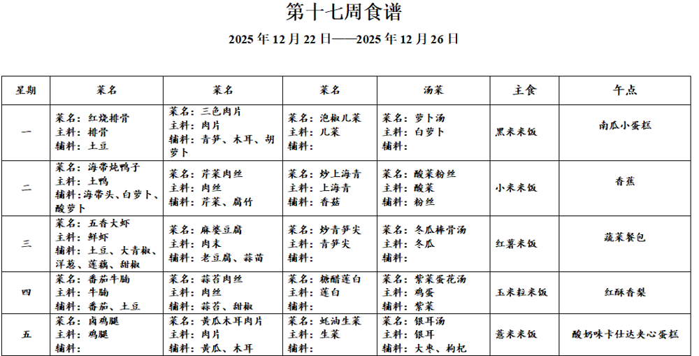 请各位家长查看第十七周午餐菜谱,若您的孩子对某样食材过敏,请一定要提前告知班主任老师哟,谢谢!