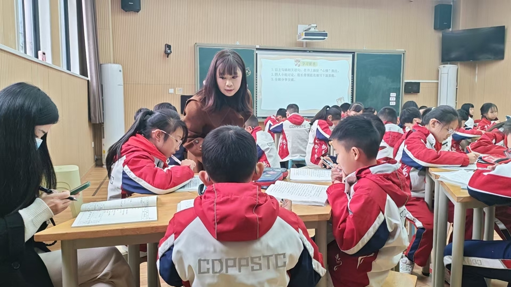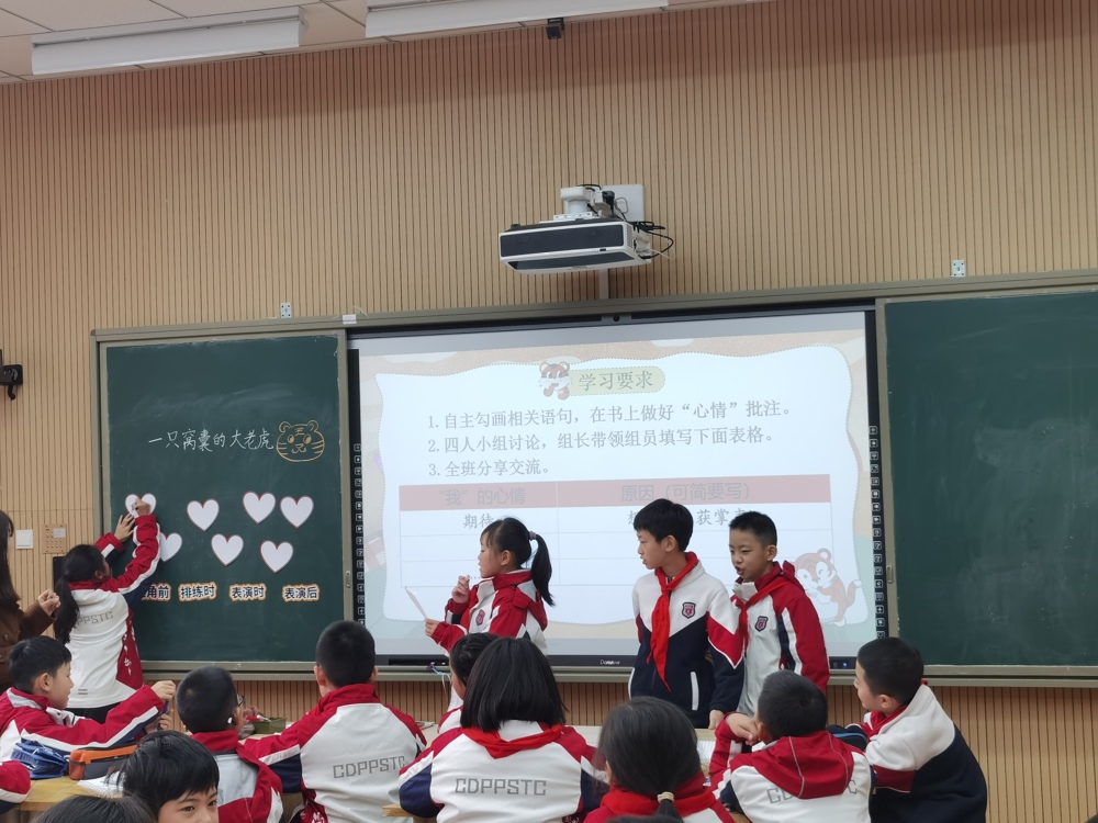 在课堂展示环节,吴翠老师以四年级语文课文《一只窝囊的大老虎》为载体,紧扣单元“童年故事”人文主题与“批注阅读”策略目标设计教学。课中聚焦“夯基础、搭支架”,通过识字词、交流批注的核心任务,帮助学生搭建批注入门的学习支架;老师围绕“深化思辨、落目标”展开,引导学生借助文中动作、语言、神态描写,分析“我”的心情变化及原因,并结合生活经验思辨“演出是否窝囊”,在语言实践中落实了“体会人物心情”“学习安慰表达”等教学重点。课堂上,小组讨论、全班交流等形式层层推进,让学生在自主批注与合作探究中深化了对文本的理解。