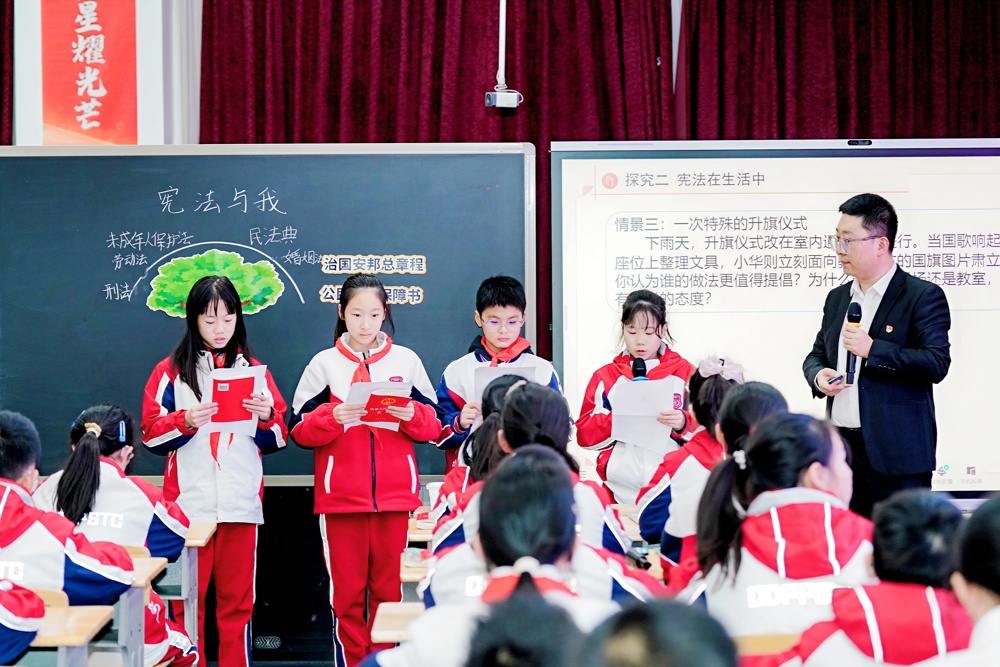 在“思政课例展示”中,张峻瑜老师执教六年级《宪法与我》一课。张老师以活动化、情境化的教学设计,通过知识竞答、小组合作探究、情景模拟、“宪法守护树”心愿卡书写及庄严宣誓等环节,引导学生理解宪法与生活的紧密联系,将法治观念教育转化为学生的情感认同与行为自觉,呈现了一节既有法治深度又有育人温度的思政课堂,展现了学科在法治教育专册教学中的实践智慧。