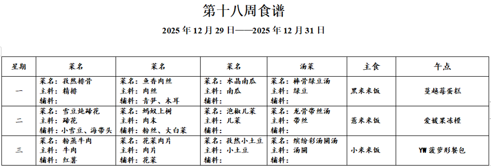 请各位家长查看第十八周午餐菜谱,若您的孩子对某样食材过敏,请一定要提前告知班主任老师哟,谢谢!
