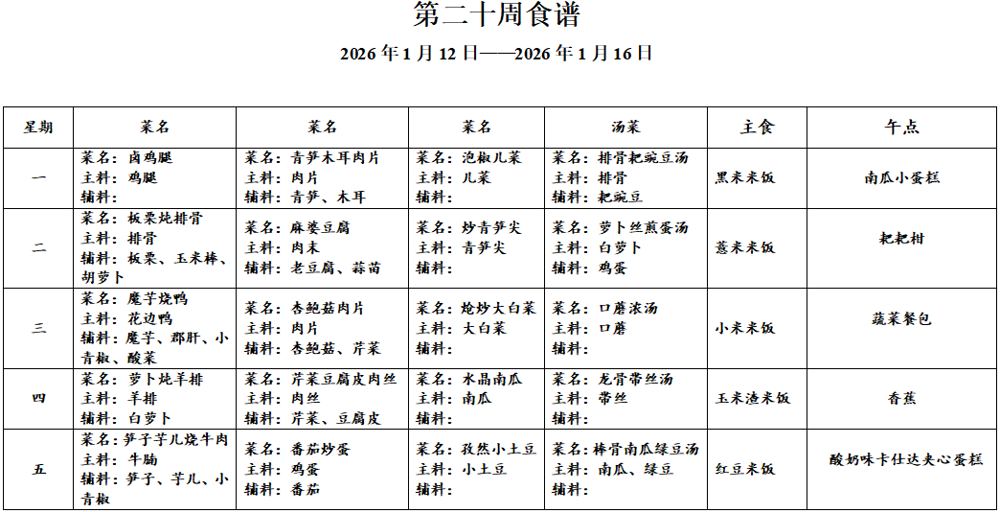 请各位家长查看第二十周午餐菜谱,若您的孩子对某样食材过敏,请一定要提前告知班主任老师哟,谢谢!