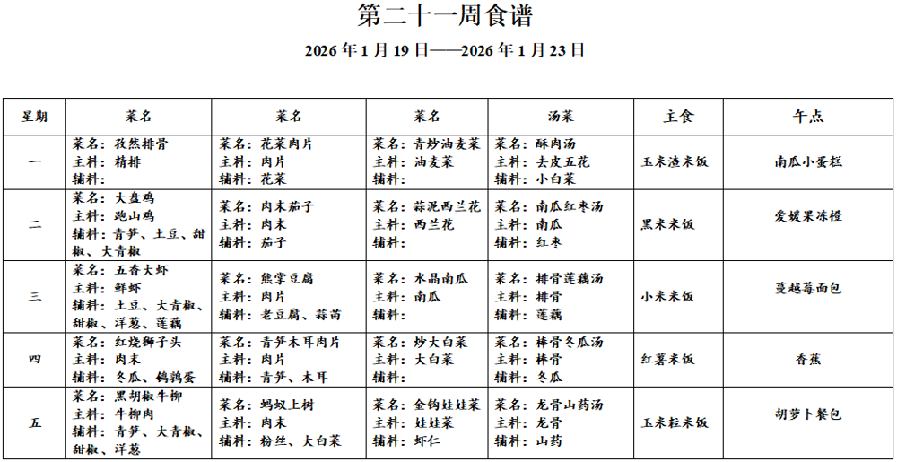 请各位家长查看第二十一周午餐菜谱,若您的孩子对某样食材过敏,请一定要提前告知班主任老师哟,谢谢!