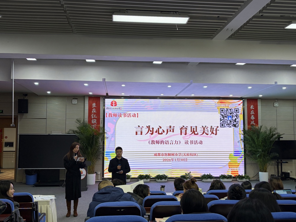 为进一步加强教师队伍建设,提升教师语言艺术与育人能力,营造书香校园、专业共进的教研氛围,2026年1月30日上午,成都市泡桐树小学(天府校区)在多功能厅成功举办了《教师的语言力》教师读书活动。
