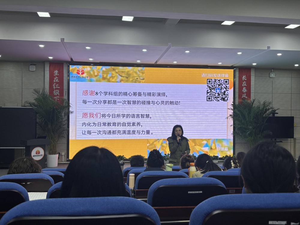 分享环节结束后,学校教师发展中心何庆华主任对本次活动进行了细致点评与总结。她高度赞扬了各学科组的精心准备与精彩呈现,并指出,教师的语言是教育生产力的重要组成部分,精准、温暖、富有智慧的语言能极大提升教育效能、深化育人效果。她勉励全体教师以此次共读共享为契机,持续锤炼语言修养,将沟通的艺术转化为日常教育的自觉实践。