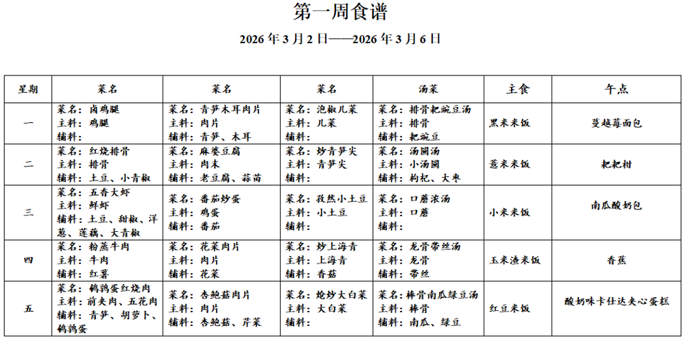请各位家长查看第一周午餐菜谱,若您的孩子对某样食材过敏,请一定要提前告知班主任老师哟,谢谢!