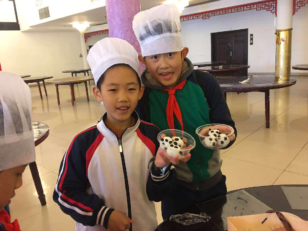 一走进博物馆,映入我们眼前的是满桌的面团和豆沙,当工作人员宣布,我们将自己动手包“熊猫蒸饺”时,大家都摩拳擦掌,准备大显身手。女同学们最在行的手工,当然驾轻就熟,看大家包的多熟练——