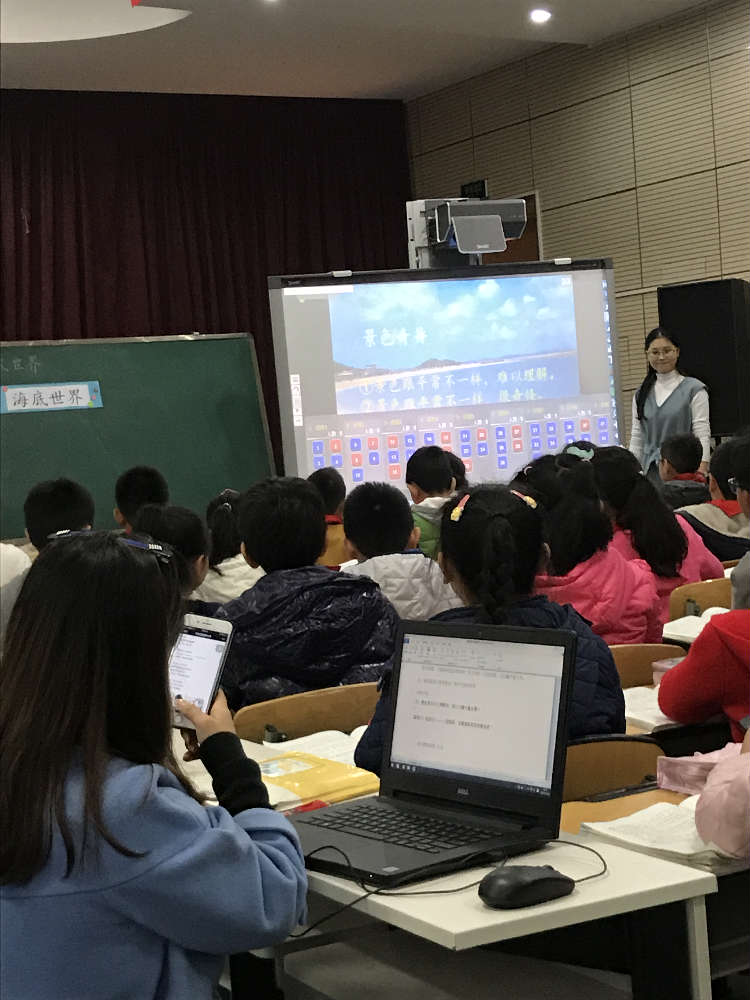 龙映霞、刘海燕、傅兮三位老师呈现了各具特色的优质课。龙映霞老师教学《神奇的海底世界》一课,学生通过同桌互读、小组讨论等多种方式寻找文中出现的动物名称和相应的活动方式,并体会海底世界的神奇有趣之处。期间利用平板填写表格,教师能在白板上一目了然地看到全班每一个孩子的答案,便捷地进行订正和反思。刘海燕老师利用反馈器教学《海底世界》一课,课中刘老师启发引导学生理解“景色奇异”、“窃窃私语”词语,让学生利用反馈器做对几种解释的正确选择,有效地和学生进行了互动,又直观地进行了知识点的修正和梳理。傅兮老师教学《我想》一课,课堂气氛活跃,孩子们动动小手指在平板上与傅老师互动,傅老师在白板上快捷地进行评价,在课堂上,学生们在云终端也接收到了多元化、个性化的学习资源。