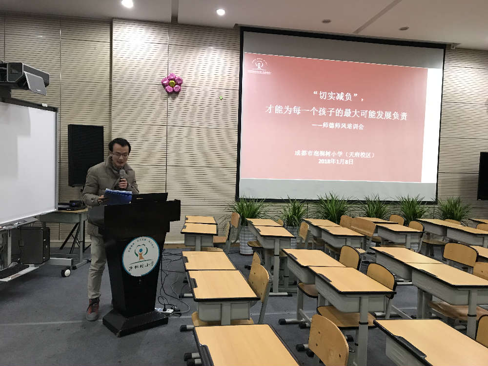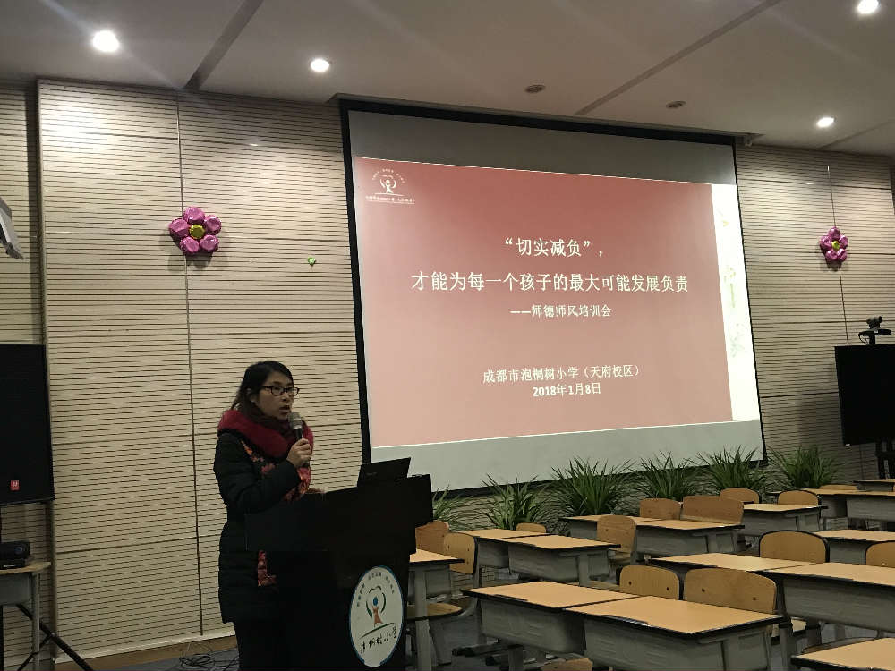 2018年1月8日,在教师发展中心欧小丽主任的主持下,给全体教师以“‘切实减负’,才能为每一个孩子的最大可能负责”为题,进行了一次师德师风培训会。
