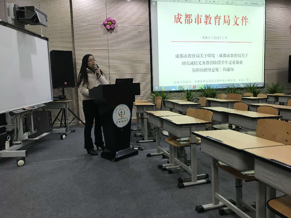 最后,由教师发展中心廖敏主任带领大家学习了成都市教育局文件成教办[2018]1号《成都市教育局关于印发<成都市教育局关于切实减轻义务教育阶段学生过重课业负担的指导意见>的通知》,认真研读了文件精神,并结合学校实际,给老师们提出了要求,尤其是关于作业量的布置、作业完成的方式、教辅资料的订购等方面做了细致的沟通,在期末复习阶段,希望各位老师心平气和对待,不给学生加重负担,用轻松有效的方式进行复习,才能收到事半功倍的效果。