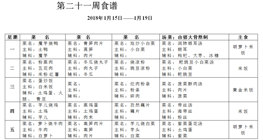 17—18学年度上期第二十一周午餐菜谱