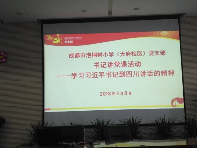 2018年3月8日,成都市泡桐树小学(天府校区)所有党员在学校多功能厅召开了“学习习近平总书记到四川讲话的精神”会议。首先,党支部组织委员罗萍同志对会议的各项事宜做出了介绍;