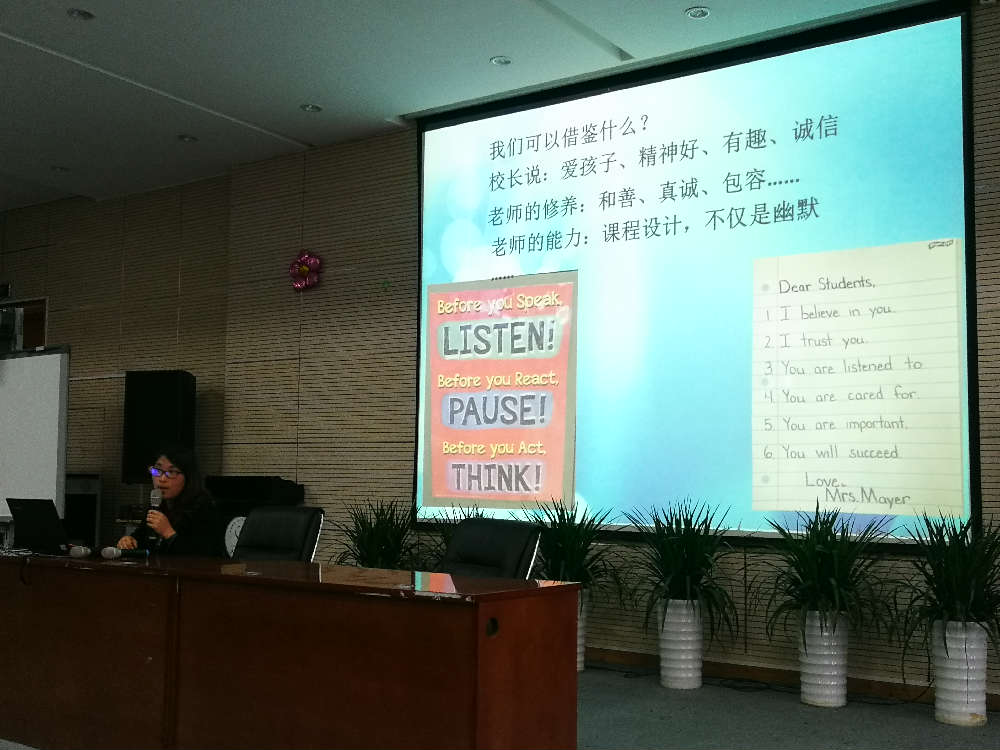 首先是赵颖老师的分享,分为游玩和学习两方面。出发前,孩子们在行前培训课上很是期待;到达后,孩子们面对眼前新的一切激动又兴奋;寄宿家庭里,孩子们感受到对方的热情与尊重;在游玩的路上,孩子们遵守规则、尽情体验;在校园里,孩子们用心感受美国课堂的点点滴滴;在语言课上,孩子们兴奋体验别出心裁的学习方法。紧接着是欧小丽老师的分享,主要为学校学习情况。欧老师分别从数学课、英语课、科学课、体育课、游戏课等课程内容以及课间休息的情况来对比中美的基础教育。通过在美国校园的学习,我们老师与孩子们感受到了有趣的课堂、以及真正的分享合作式课堂,从中也深深体会到了什么是尊重与包容的教育。