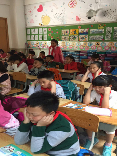 课间的眼保健操时间孩子认真地做操