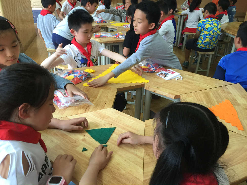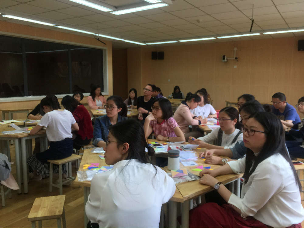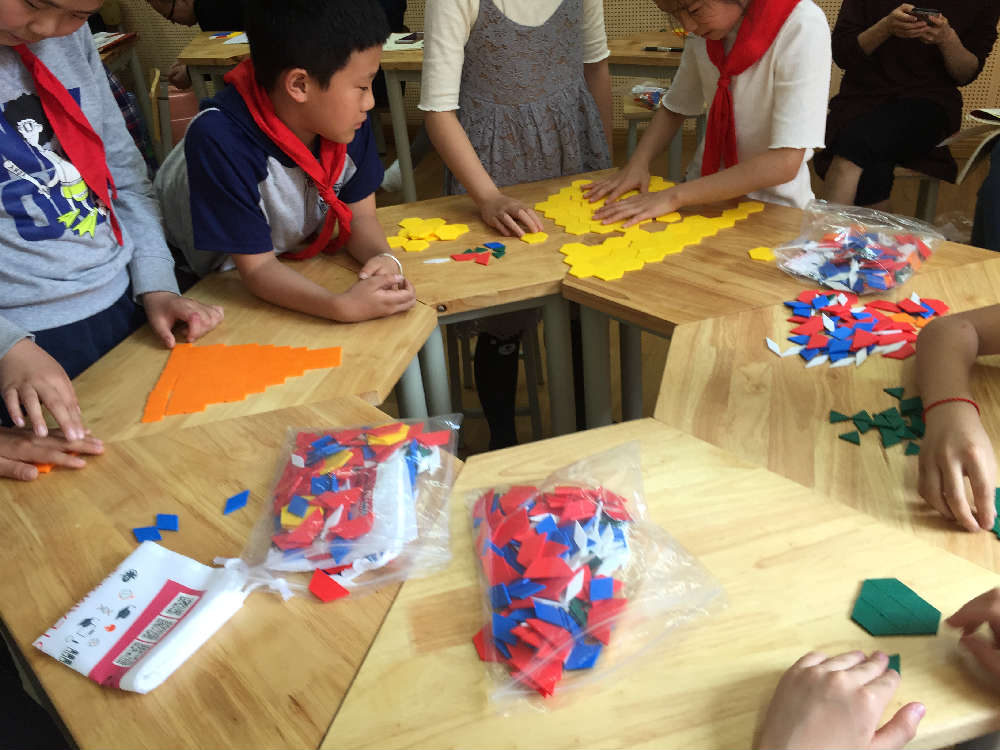 2018年4月18日,数学组再次展开数学沙龙——有趣的图形。参与者:全体数学老师。来自台湾的吴老师带领四年级的小朋友为我们展开了一节有趣的数学活动课。课堂上,吴老师让同学们每人准备等边三角形,正方形,六边形各5个。通过观察,动手操作,带领同学们在图形的世界遨游。课堂有趣,生动,同学们都不愿意下课。展示课后,听课老师就这次数学活动进行了讨论,充分理解本次课每一个活动的设计原理。接下里,老师们通过动手操作,学习,体验此次的图形之旅。
